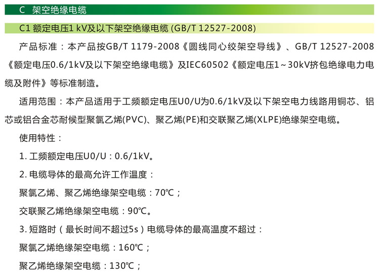 二、使用范圍 本產品適用于工頻額定電壓U0/U為0.6/1kv及以下架空電力線路用銅芯、鋁芯或鋁合金芯耐候型聚氯乙烯(PVC、聚乙烯(PE)和交聯聚乙烯(XLPE)絕緣架空電纜。