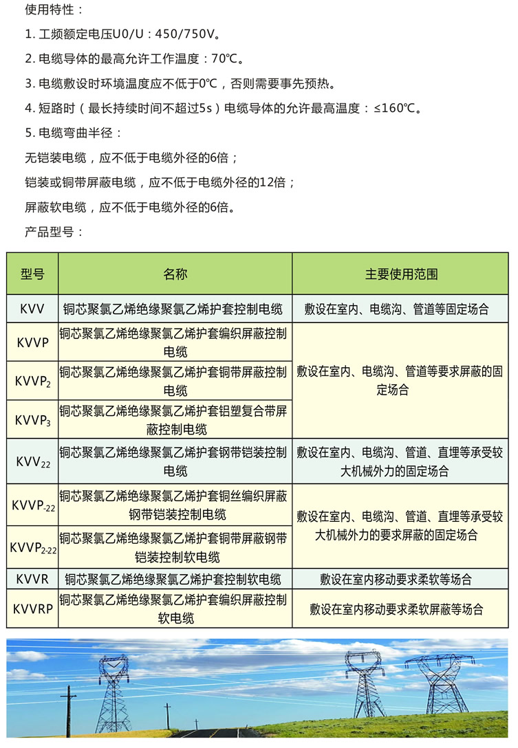 二、使用范圍   聚氯乙烯絕緣聚氯乙烯護套控制電纜適用于額定電壓450/750v及以控制、信號、保護及測量系統接線之用。